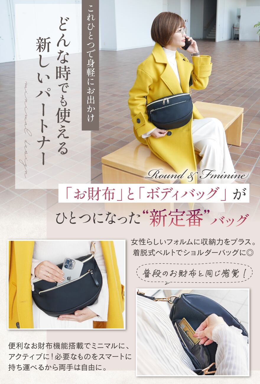 人気のお財布付きボディバッグにマチがついた大容量タイプ。